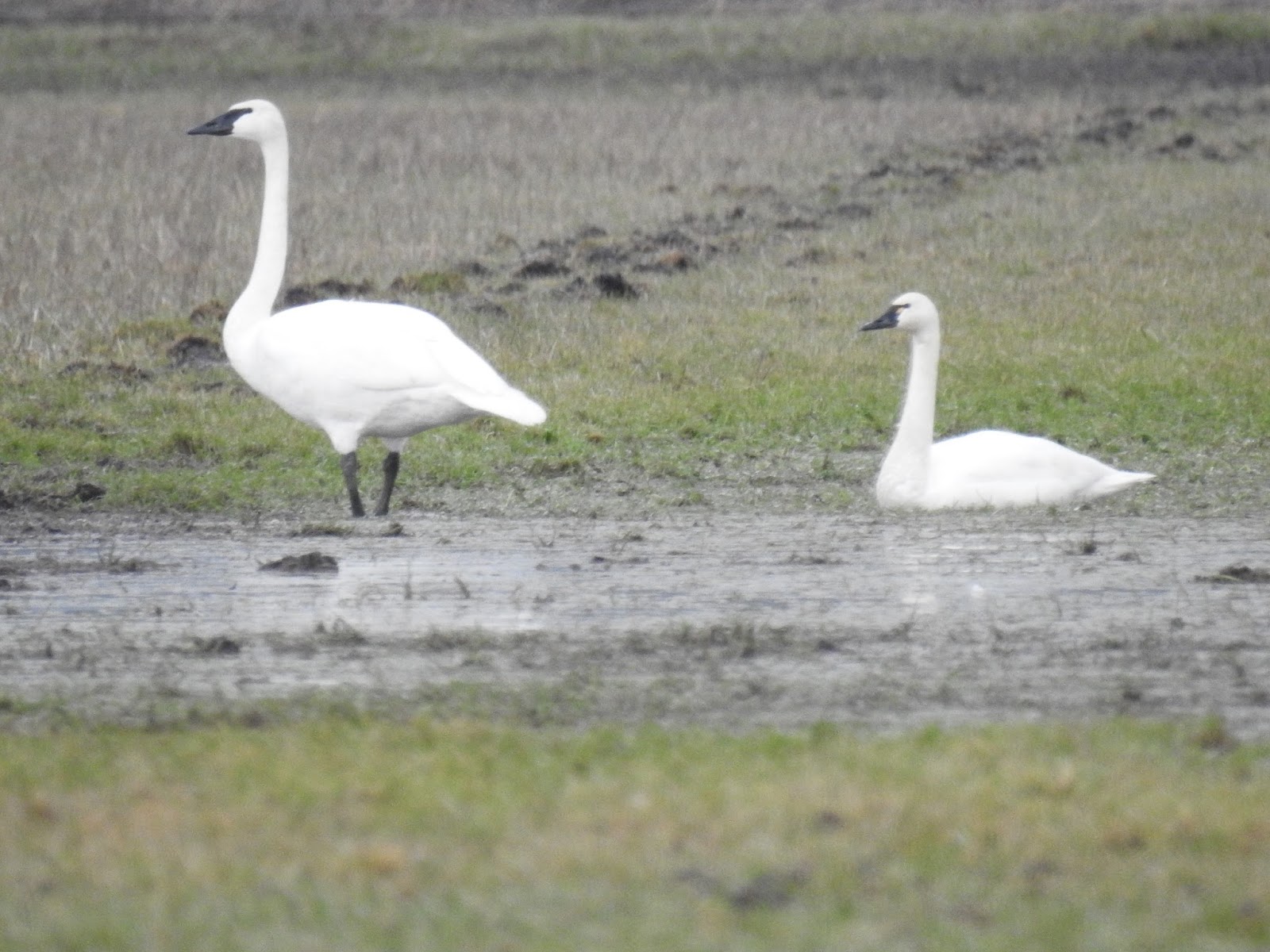 2/3/17 - The weatherman said it might snow last night, or possibly sleet, so when I got up I looked outside and there was only a skiff of sleet. With temperatures expected to rise and heavier rain later in the day, I started scheming where I might go birding. After breakfast with my wife (of course), I headed over to Pedee where I know of a small patch of old growth forest where I might find some Red Crossbills. This is an “irruptive” species, meaning they can travel (irrupt) for many miles to suitable cone crops, and this appears to be one winter for such. On the way there I saw a flock of 23 Wild Turkeys (103). Once in the area I kept scanning the tops of Douglas Fir trees for crossbills, but the rain kept getting worse, so I scrapped that idea and headed back into the valley and figured I’d drive around birding. Near the place where I saw the turkeys I found 2 male Ring-necked Pheasants (104). Some 5 miles after that I was in the valley proper and found some swans and took this picture of a "pair." I only zeroed in on one to ID it as a Trumpeter Swan but when I got home and put the pics on the Mac, it was obvious the second bird was a Tundra Swan.
